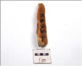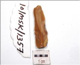 | Description / विवरण | A blade made on chert with ridge on dorsal, prominent bulb on ventral end, prepared platform, use wear marks on the cutting edges. |
