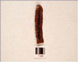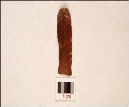 | Description / विवरण | A chert blade, prominent bulb on the ventral, ridge on dorsal, distal end intact, partly retouching on the cutting edges. |