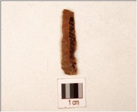 | Description / विवरण | A chert blade, ridge on dorsal, prepared platform, use wear marks on the cutting edges. |
