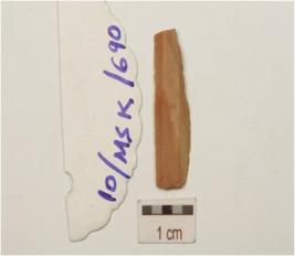 | Description / विवरण | Blade made on chert, two ridge on the dorsal side trapezoidal cross section, wear marks along cutting edges and prepared platform. |