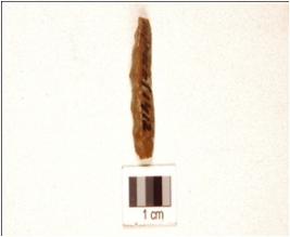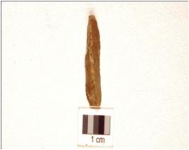 | Description / विवरण | A chert baked blade, ridge on dorsal, prepared platfrom on the proximal end, use wear marks on the cutting edges. |