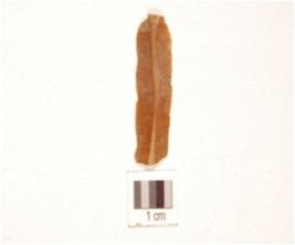 | Description / विवरण | A paralled sided blade made on chert, ridge on dorsal, diffused bulb on ventral, use marks on along working edges and triangular cross-section. |
