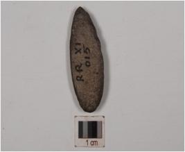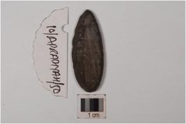 | Description / विवरण | A stone point, having mid ridge on dorsal surface vental surface is smooth and use mark on edge. |