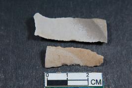 | Description / विवरण | Fragment of a blade with two dorsal ridges having smooth surface and shorter blade along with one dorsal ridge has Length- 2.8 cm, Breadth- 0.8 cm |