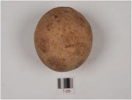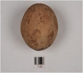 | Description / विवरण | A handmade sling ball of terracotta, solid dots on whole round surface, painted in chocolate brown pigment and of fine fabric. |