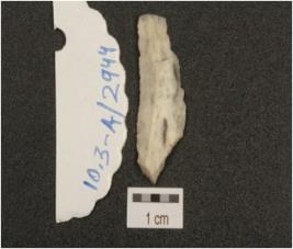 | Description / विवरण | Utilized flake made on chert, flake scars on dorsal prominent bulb on ventral and wear marks along cutting edge. |