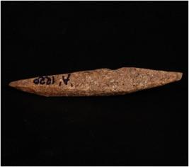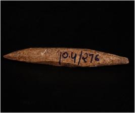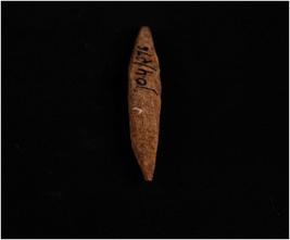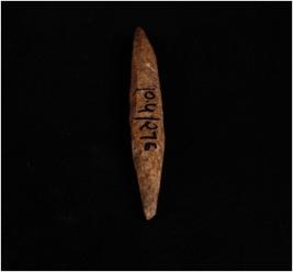 | Description / विवरण | Handmade bone point, dark brown in colour. Both ends are pointed. Uneven and rough surface. Circular-cross section. |
