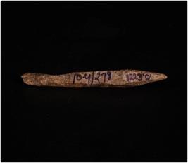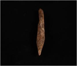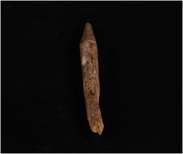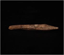| Description / विवरण | Bone point. Dark brown in colour. One point partially and other one end is thickened and broken. Uneven and rough surface. Circular section. |