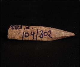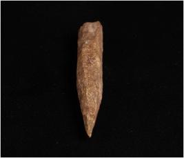 | Description / विवरण | Bone point, dark brown in colour. Similar to point but it has only one pointed other end has thicker. Uneven in shape and rough surface. |