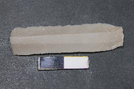 | Description / विवरण | Fragment of blade with positive bulb of percussion on its ventral side, two dorsal ridges and smooth surface. |