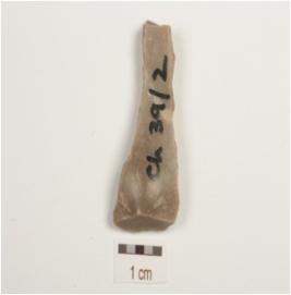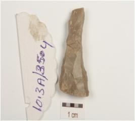 | Description / विवरण | A flake made on chert, flake scars on surface, rectangular cross-section, prominent bulb, wear marks along the cutting edges. |