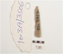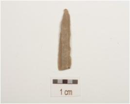 | Description / विवरण | A blade made on chert with double ridge on dorsal trapezoidal cross-section and wear marks along the cutting edges. |