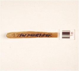 | Description / विवरण | A parallel sided blade made on chert two ridge on the dorsal side bulb on ventral side and use marks on along working edges |