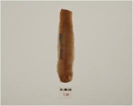 | Description / विवरण | A chert blade prepared platform on the proximal end and prominent bulb on the ventral middle ridge on dorsal partly retouching on the cutting edges. |