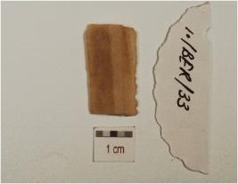 | Description / विवरण | Fragment of a chert blade, double ridge on the dorsal and use-wear marks on cutting edges. |