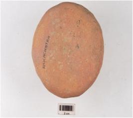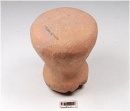| Description / विवरण | A handmade terracotta dabber, convex circular top partly damaged, circular convex bottom, surface treated with red slip, hour glass like vertical section. |