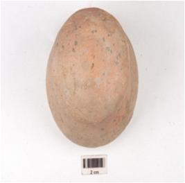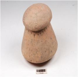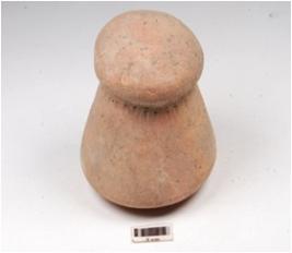 | Description / विवरण | A handmade terracotta dabber, convex circular top, convex circular base, grooved dotted design along the neck, surface treated with red slip, hour glass like vertical section. |
