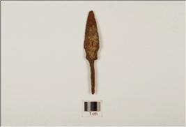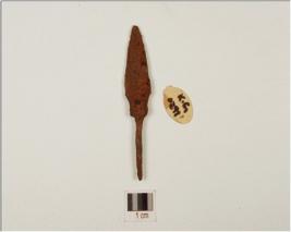 | Description / विवरण | Fragment of iron arrowhead, tanged long shaft, lenticular cross-section and rusted. |