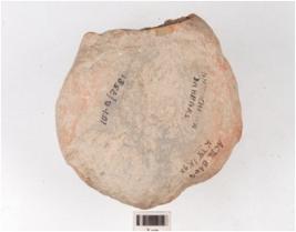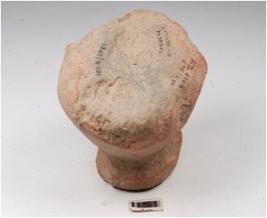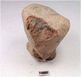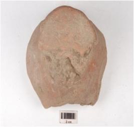 | Description / विवरण | Fragment of a handmade terracotta dabber, partly broken flat circular top, flat base highly damaged, treated with slip in red colour, hour glass like vertical section. |