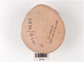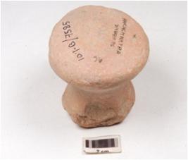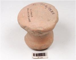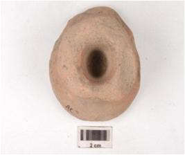 | Description / विवरण | Fragment of a handmade terracotta dabber, circular top with a circular socket at the centre, convex circular bottom, hour glass like vertical section and surface treated with red slip. |