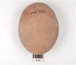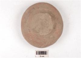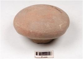 | Description / विवरण | Fragment of a handmade terracotta dabber with circular convex base, broken top and surface treated with red slip. |