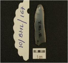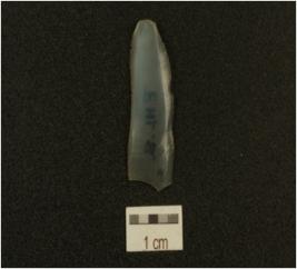 | Description / विवरण | Fragment of blade mode on chalcedony, has prominent bulb on ventral side, thin cross-section distal end broken and use-marks along the cutting edges. |