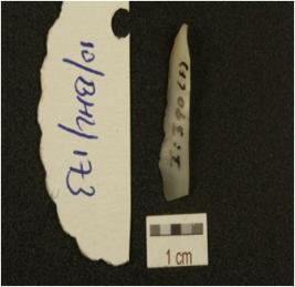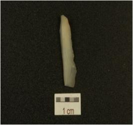 | Description / विवरण | A blade made on chalcendony, had mid- ridge on dorsal ride, prepared platform, prominent bulb on ventral side, triangular cross-section, distal end broken and use-marks along the cutting edges. |