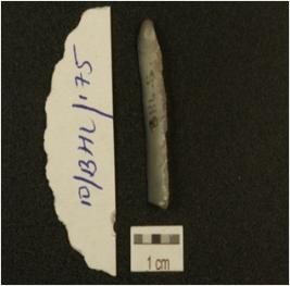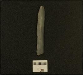 | Description / विवरण | A blade made on chalcedony, has double ridge on dorsal side, prepared platform, prominent bulb on ventral side, triangular cross-section, distal end broken and use-marks along the cutting edges. |