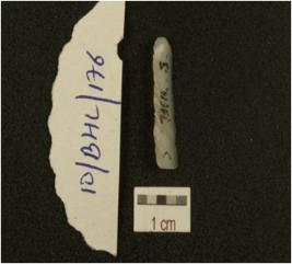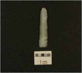 | Description / विवरण | A blade made on chalcedony, has mid ridge on dorsal side, prepared platform, prominent bulb on ventral side, triangular cross-section, distal end broken and use marks along the cutting edges. |