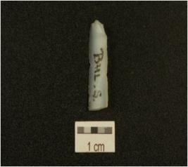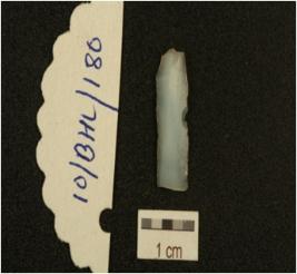 | Description / विवरण | Fragment of blade made on chalcedony, ridge on dorsal side, prepared platform, diffused bulb on ventral side, triangular cross-section, and use-marks along the cutting edges. |