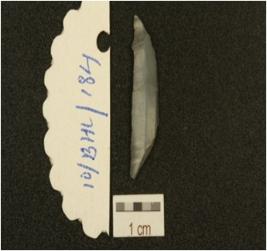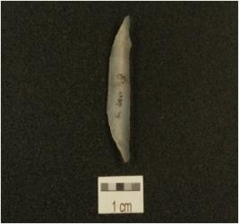 | Description / विवरण | Fragment of lunate made on chalcedony, has mid ridge on dorsal side, triangular cross-section and use- marks along the cutting edges. |