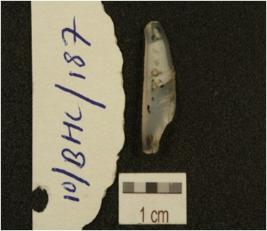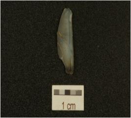 | Description / विवरण | A blade made on chalcedony, has ridge on dorsal side, diffused bulb on ventral side, triangular cross-section and use marks along the cutting edges. |
