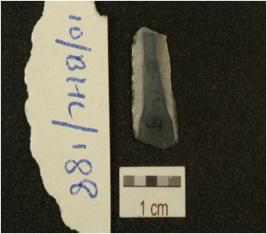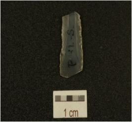 | Description / विवरण | Fragment of blade made on chalcedony, double ridge on dorsal side, triangular cross-section and use marks along the cutting edges. |