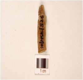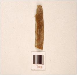 | Description / विवरण | A knife blade made on chert mid-ridge on dorsal use mark on edges and prominent bulb on proximal end. |