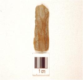 | Description / विवरण | A parallel sided blade made on chert ridges on surface use marks on edges diffused bulb on ventral. |