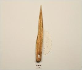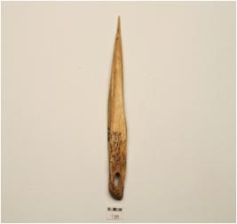 | Description / विवरण | A needle made on bone, pointed with one end and perforation at the other end, smooth surface. |