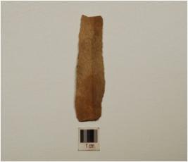| Description / विवरण | A blade made on chert, midridge on the dorsal side, use wear marks along the cutting edges. |