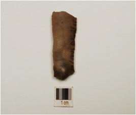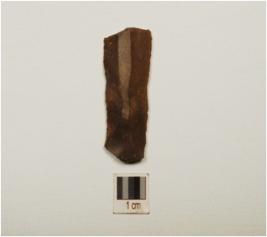 | Description / विवरण | A fragment of blade made on chert, bulb of percussion on the ventral side, prepared paltform on the proximal end, mid ridge on the dorsal end use wear marks along the cutting edges. |