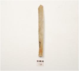 | Description / विवरण | A blade made of chert, ridge on the dorsal side, triangular cross section and bulb on the ventral side. |
