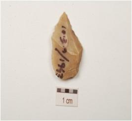 | Description / विवरण | A point, made of chert, bulb on the ventral side, pointed along one end and retouched cutting edges. |