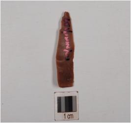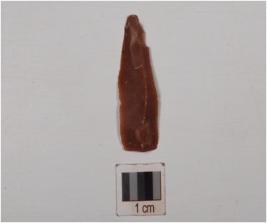 | Description / विवरण | A blade made on chert a ridge on dorsal side, diffused bulb on ventral side with ripple marks, triangular cross-section, distal end broken and use-marks along cutting edges. |