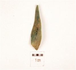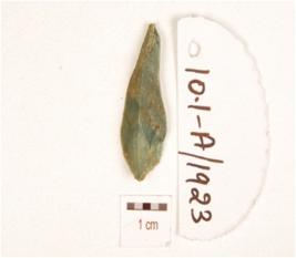 | Description / विवरण | A chert blade with prominent bulb on ventral side, prepared platform and use-wear marks along the cutting edge. |