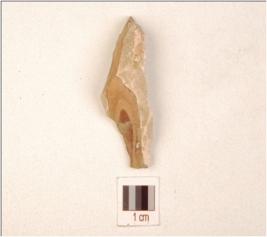| Description / विवरण | A knife blade made on chert, ridge on dorsal, use marks on edges and prominent bulb on ventral. |
