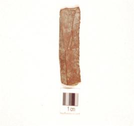 | Description / विवरण | A parallel sided beked blade on chert, flake scars and ridge on dorsal side and use marks on along working edge. |