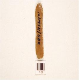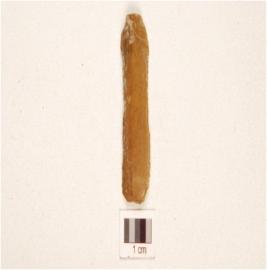 | Description / विवरण | A parallel sided backed blade made on chert, flake scars and ridges on the dorsal side, use marks on along the working edge. |