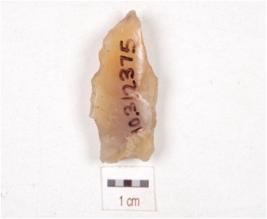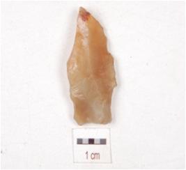 | Description / विवरण | A triangular shaped utilized flake of chalcedony with ripple marks and use-wear marks an working edge. |