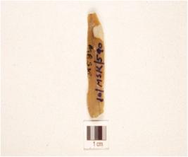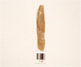 | Description / विवरण | A parallel sided blade, made on chert, ridge and flake scars on dorsal bulb on ventral and use marks on along working edges. |