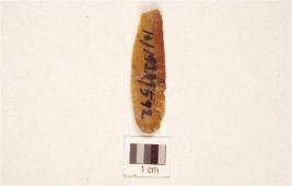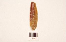 | Description / विवरण | A blade made on chert ridge on the dorsal bulb on ventral, and use marks on along working edges. |