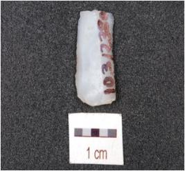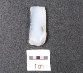 | Description / विवरण | Fragment of a parallel sided blade with trapezoidal cross section, prepared platform and prominent bulb on the ventral side and use marks along the cutting edges. |