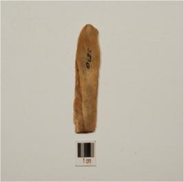 | Description / विवरण | A blade made on chert, bulb on ventral side and double ridge on the dorsal side and use marks on working edges. |